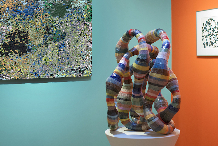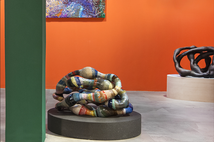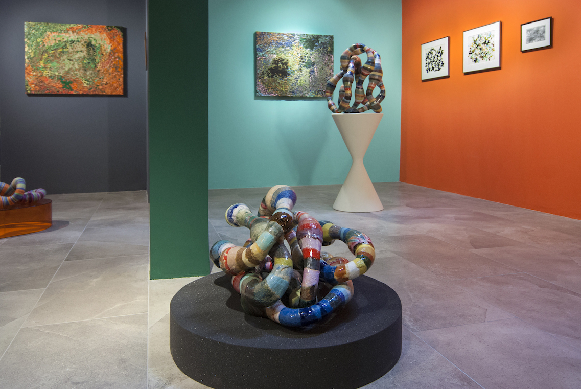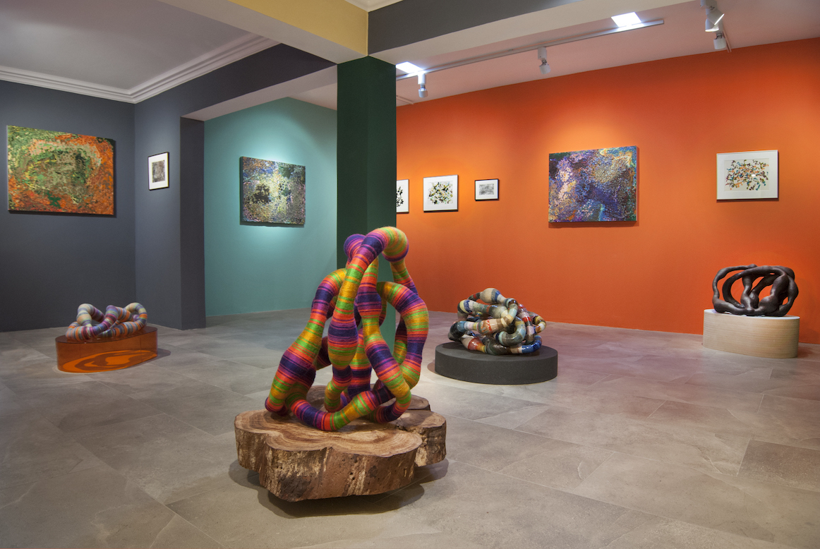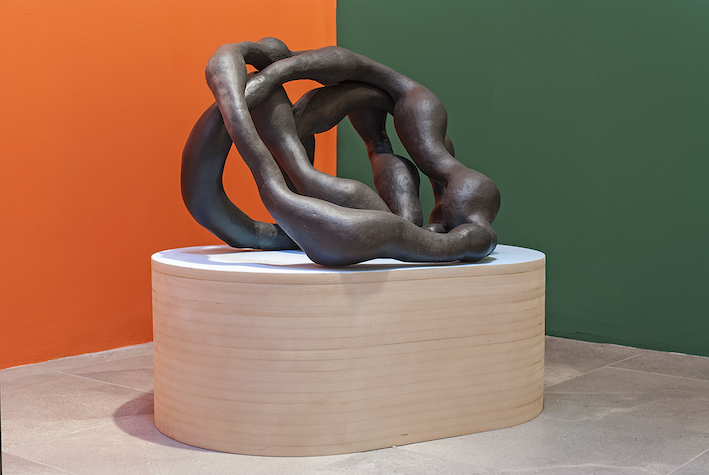 La exposición TRES AMANTES reúne un conjunto de esculturas, pinturas y dibujos recientes que, siendo abstractos, están habitados por la presencia de los cuerpos. Referencias variadas, a la escultura modernista, a la artesanía altiplánica o a fenómenos naturales, se materializan en imágenes sugerentes, que invitan a ser tocadas con la mirada y contempladas con el tacto.